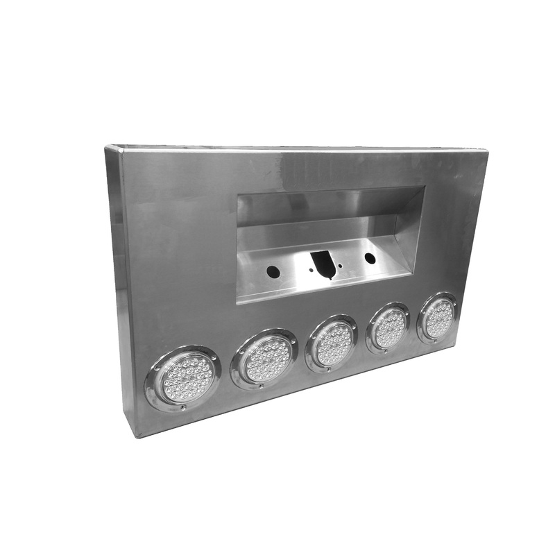 Drop Rear Center Panel|33 In. W X 20 In.|(5) 4 In. Light Holes|Airline Box – Trailer Air And (1) 7-Ways – (5) 4 In. Round Light Holes||8 304 Polished Stainless Steel