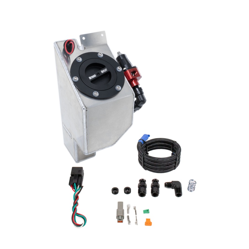 Nitrous Outlet’s dedicated fuel systems come complete with a custom built hand welded 1.7 gallon fuel cell, mounting brackets, E85 compatible in tank fuel pump, Aeromotive fuel regulator, Aeroquip 6AN hose, fuel lines, and fittings.