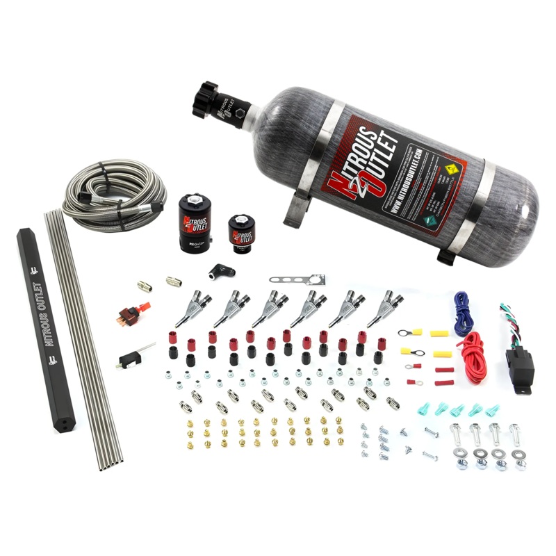 This system includes all of the necessary components; One nitrous, and one fuel solenoid, 6 wet Stainless Steel Straight Blow Through nozzles, 12ft of hardline, all jetting, hardware, and electrical to install a direct port nitrous system capable of flowing 400+HP per stage on your vehicle.