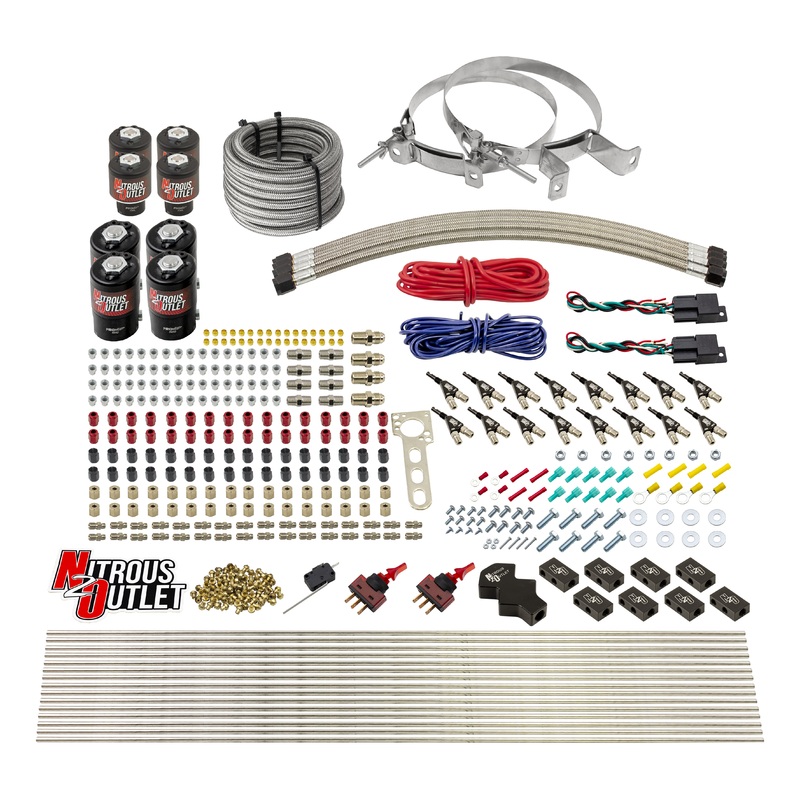 This system includes all of the necessary components; One .178″ nitrous solenoid, weld on solenoid brackets, eight stainless steel plate fittings for nitrous discharge, 8ft of nylon hose, 100, 200, 300, and 400 horsepower nitrous jetting, all hardware, and electrical to install a direct port nitrous system capable of adding 400+HP per stage to your vehicle.