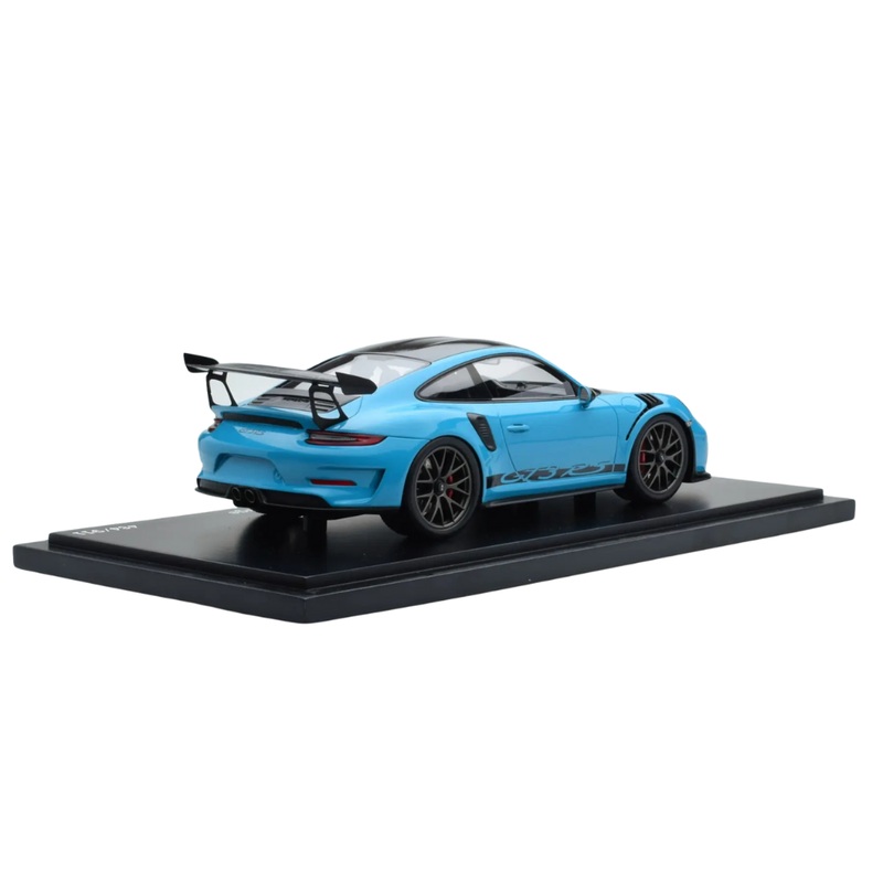 Authentic Design: The model features a vibrant Miami Blue exterior perfectly complemented by a sleek black interior, meticulously replicating the aggressive and purposeful aesthetic of the real GT3 RS (991.2) with its performance-enhancing Weissach Package.