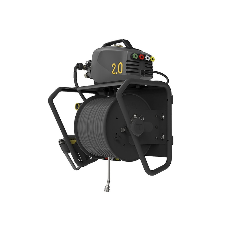 This package includes a hose reel capable of storing up to 100 3/8 hose and 150 5/16 hose, wall mount cage with dedicated slots for pressure washer gun, foam cannon, lance and 4 nozzles. A 16 backing plate for safe mounting on the wall and a 5/16 diameter jumper hose with an M22-14mm connector for install with the pressure washer.