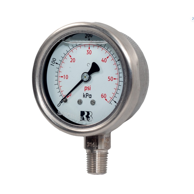 The AD-D-2 Pressure Gauge features a 63mm dial with a 304 stainless steel case, 316 stainless steel bourdon tube and connection, and a glass lens. It has a dual scale (kPa/psi) and a NPT lower mount. The accuracy is 1.6% of full scale, and it is supplied dry (liquid filling is available upon request).
