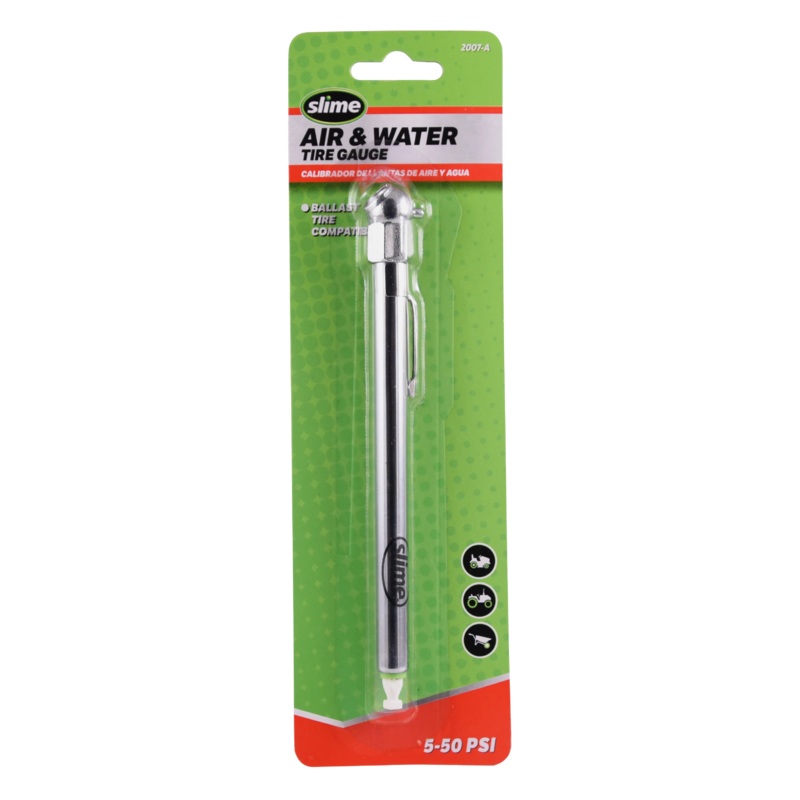 If you’re ballasting your tires, regular monitoring of your tirepressure is essential. Slime’s Air & Water Pencil Tire Gauge was designed specifically for ballast tires, and easily clips onto a pocket, so you’ll always know where it is.