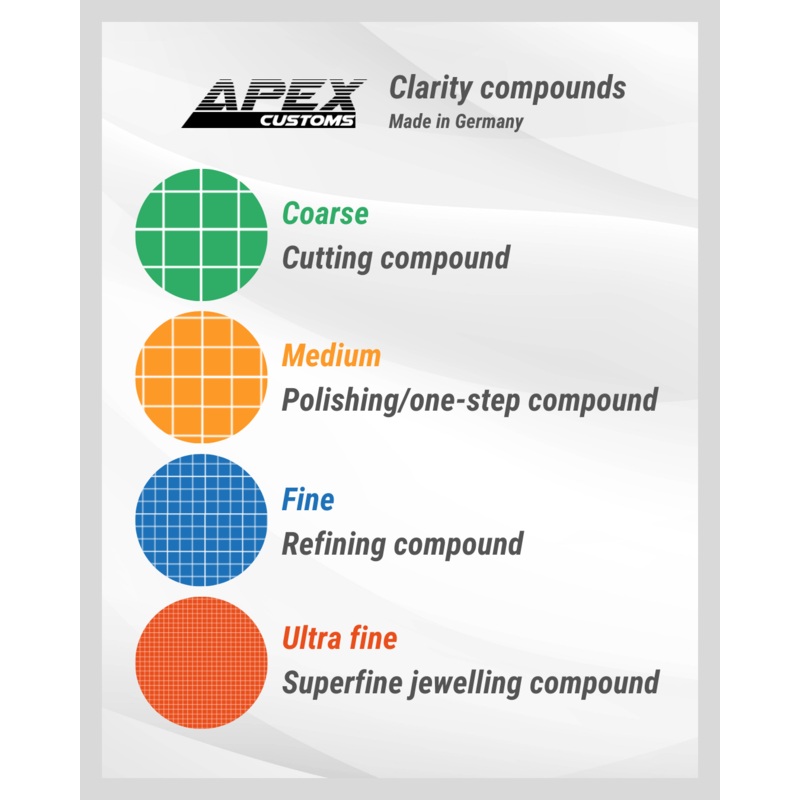 Application: Apply 2-3 pea-sized drops to a cutting pad, such as Apex Customs Cutting Pad. Start on a low-speed setting with the polisher to prime the pad and surface. Dial the speed up and guide the polisher on the surface and allow the weight of the polisher and compound to do the work. Work area in 3-4 passes until compound becomes clear. Remove residue with a clean microfibre cloth.