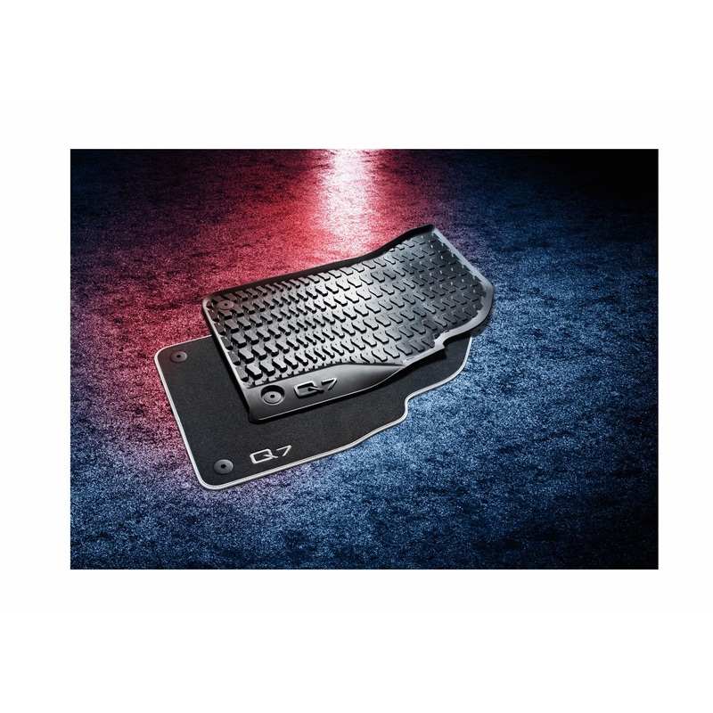Rubber mats which are perfectly shaped to fit the footwells of your Audi. Manufactured from an ecologically-compatible rubber mixture. Includes an anti-slip design backing and secure fastening points to the vehicle floor that ensure the mats sit firmly in place and do not slip. Branded with the model name.