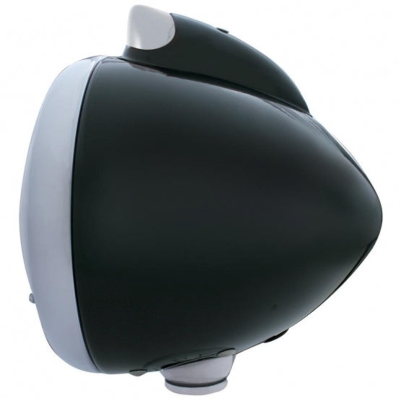 *Gloss black powder coated steel headlight housing with matching top mount cover and beautiful chrome plated bezel.