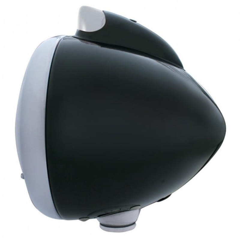 *Gloss black powder coated steel headlight housing with matching top mount cover and beautiful chrome plated bezel.