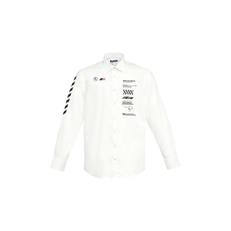 Large Motorsport print on the left side of the chest, including with BMW Motorrad Motorsport inscription, Racing like no other inscription and RR badge. Small M logo on the right side of the chest. Large, vertical BMW Motorrad Motorsport inscription on the back.