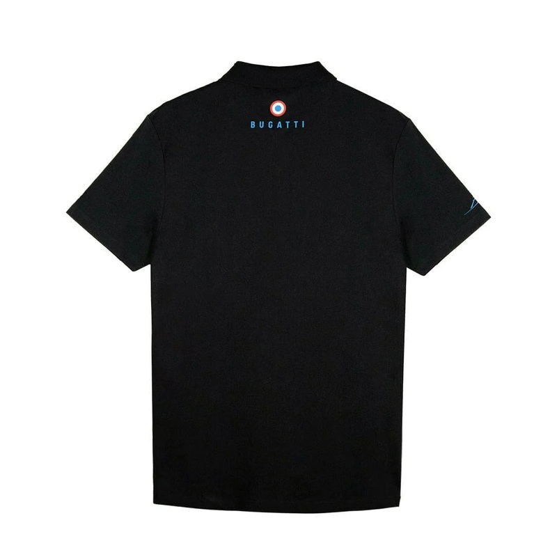 This black, short-sleeved polo shirt boasts a large blue pocket in a striking blue, and the iconic Bugatti wordmark on the back.