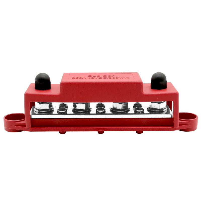 This marine/automotive power distribution block can handle a continuous amperage Max 250A DC. The cover allows 180-degree wire lug installation and is suitable for most installation methods and end terminals.