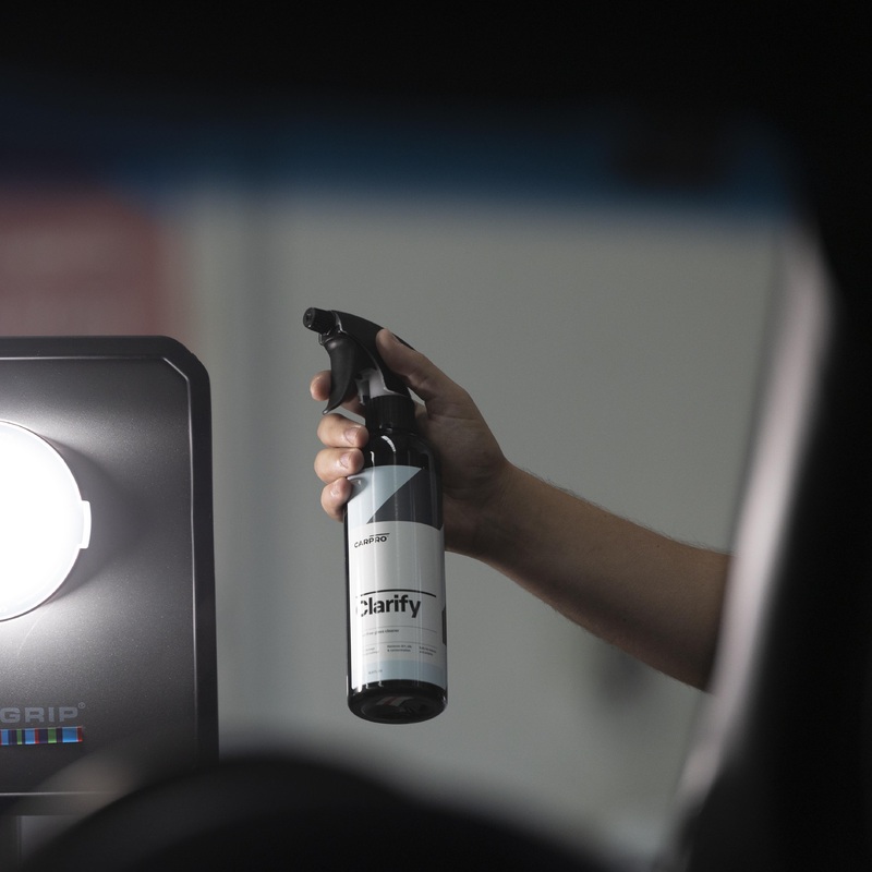 - Spray Clarify 1-2 times on a CARPRO GlassFiber MF glass cleaning towel or CARPRO GlassMitt.