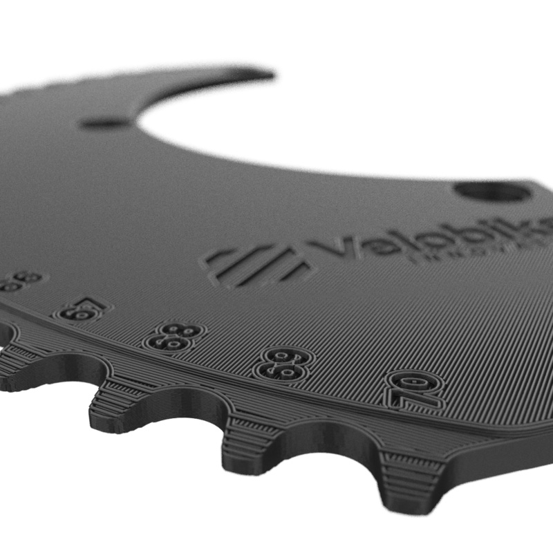 We developed this handy tool to do just that. Each tooth on the gauge represents a different size chainring from 49 to 70 teeth.