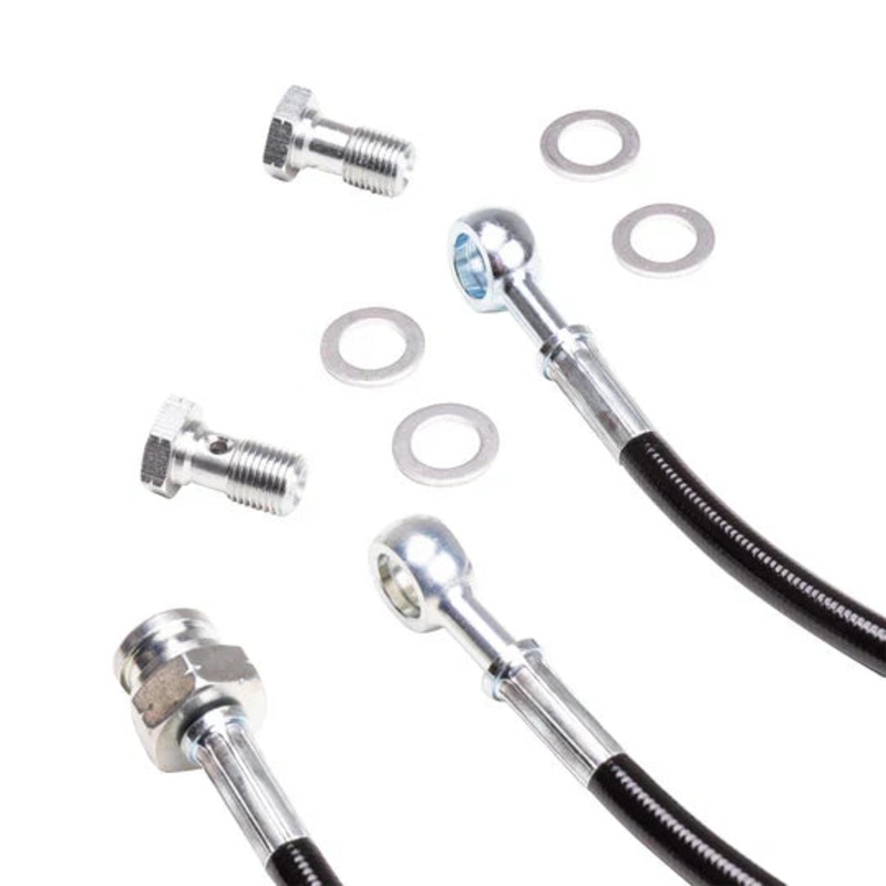 The Chase Bays Fenderwell Caliper Brake Lines are for the enthusiast who wants to increase braking response, improve pedal feel, and upgrade to a more durable setup. The OE rubber hard lines are upgraded and replaced with -3AN stainless steel braided, Teflon PTFE lined, black PVC coated lines. We use the best components in the industry and we pressure test every line we assemble.