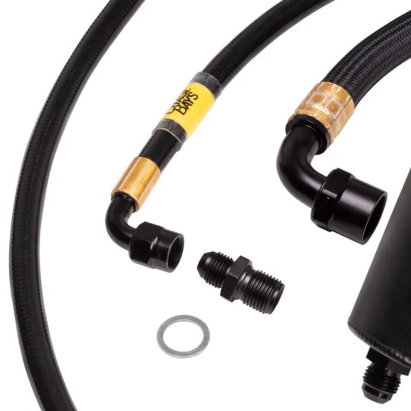 Chase Bays’ over-engineered Triple-Baffled Power Steering Reservoir (aeration and spillover proof) is at the core of this kit. It optionally comes with an upgraded black aluminum heatsink cooler that mounts on the upper core support (see photos) for easy install and additional airflow. Chase Bays only uses the highest quality components available. Our reservoir is constructed of 6061 aluminum and is anodized black with a laser etched cap. The reservoir itself uses a aluminum bracket which can be mounted in the stock location.