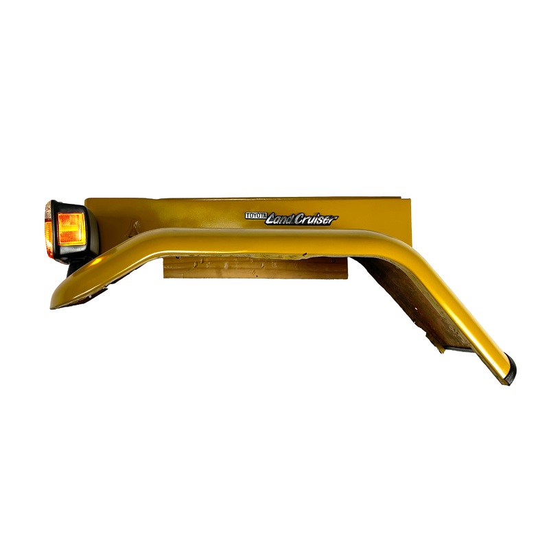 Custom Land Cruiser wall mounts made from original Toyota parts. Fitted with LED lights, this functional plug-and-play art piece comes ready to hang and is the perfect addition to your garage, office, or living room (assuming your significant other approves). Sure to make your Land Cruiser friends jealous, these limited pieces of authentic automobilia are unique and hand assembled using original perfectly patina’d parts.