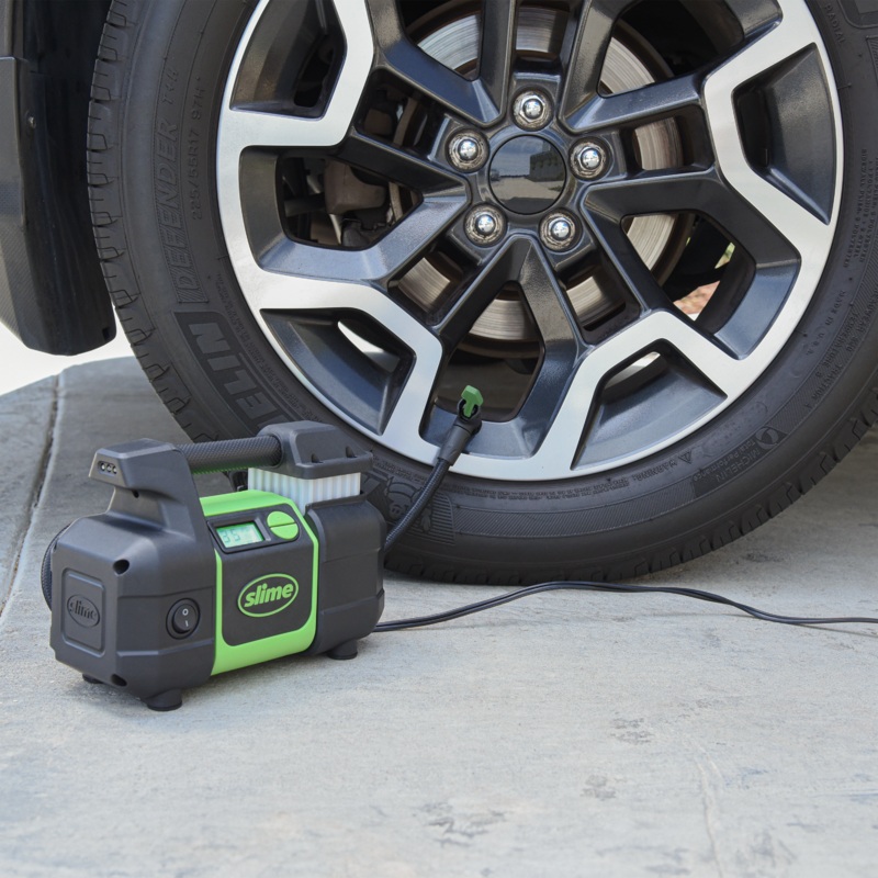 Slime’s Digital Pro Power Tire Inflator also includes a direct drive motor, athermal break feature to prevent overheating, a bright LED light for nighttime emergencies and an easy-to-read backlit digital display. Stores easily in the included canvas carrying bag and inflates a standard car tire in just 3 minutes!