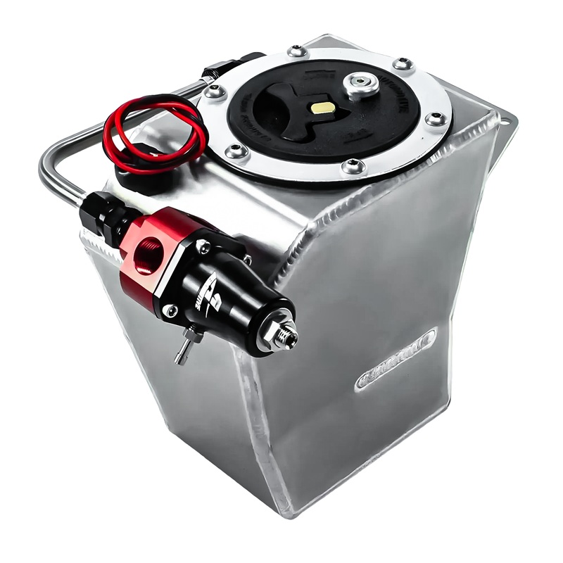 Heavy Duty Construction. Nitrous Outlet’s dedicated fuel systems come complete with a custom built hand welded 0.89 gallon fuel cell, mounting brackets, E85 compatible in tank fuel pump, Aeromotive fuel regulator, Aeroquip 6 An hose, fuel lines, and fittings.