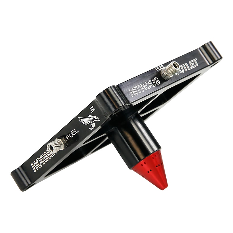 The Hornet 3 is a dual-entry, dual-stage nitrous plate that provides a max flow of 870hp! The fuel discharge ports are on top and discharge at a downward angle towards the horizontal nitrous discharge. The nitrous will mix into the air stream allowing the engine vacuum to pull it into the cylinder. Distribution into the engine is dictated by the intake wall height and runner placement.