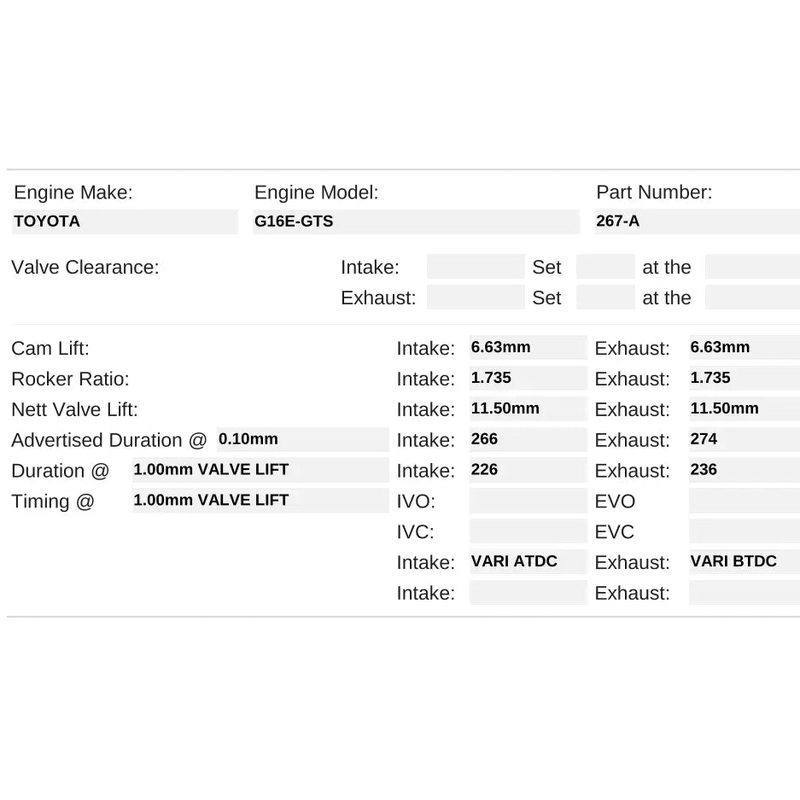 - Cam Lift: Intake 6.63mm / Exhaust 6.63mm