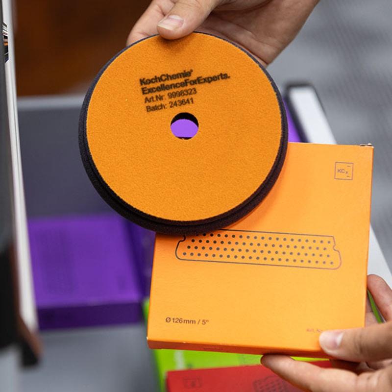 The One Cut Foam Pad from Koch Chemie hits the sweet spot when you need real cutting without stepping into the heavy compound territory. Designed specifically to pair with Koch Chemie’s One Cut & Finish P6.02, it combines moderate abrasiveness (rated 5/10) with an open-cell structure that keeps heat down and polishing performance up. Its balanced compression hardness of 12 gives just enough firmness for cutting power while still conforming well to curved panels and tight spots.