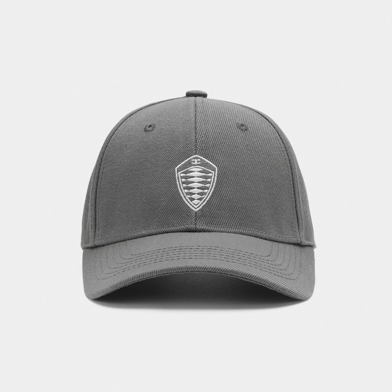 This classic grey baseball cap is adjustable and features an embroidered Koenigsegg shield on the front in silver stitching.