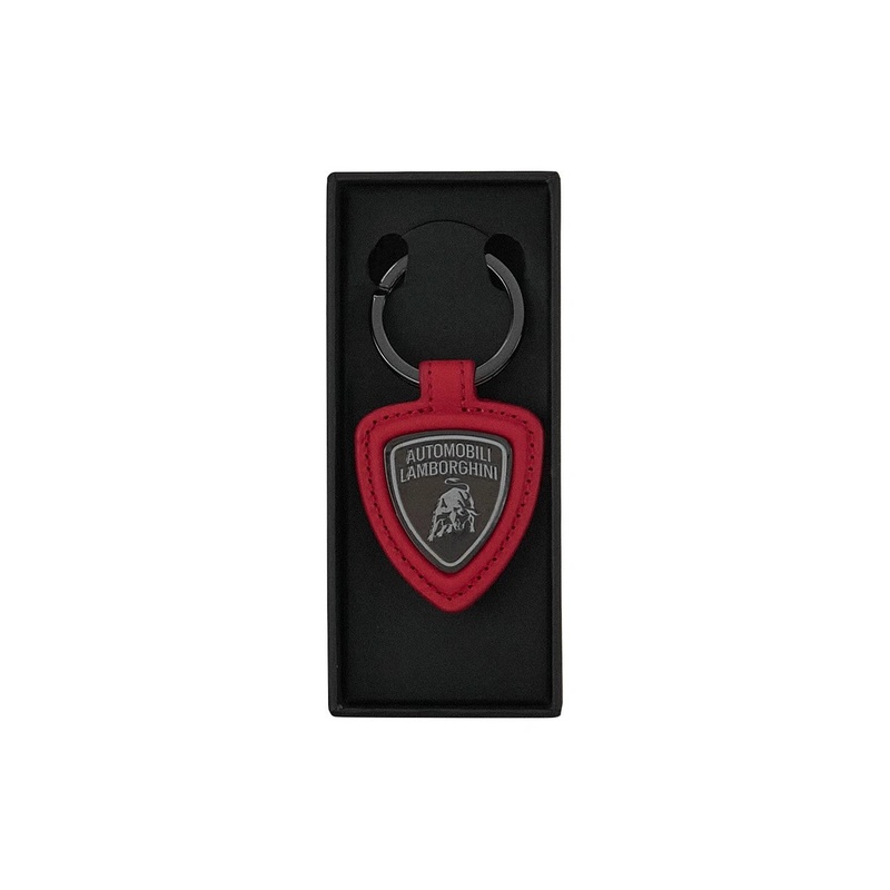 Upcycled leather Automobili Lamborghini keyring with metal shield logo.