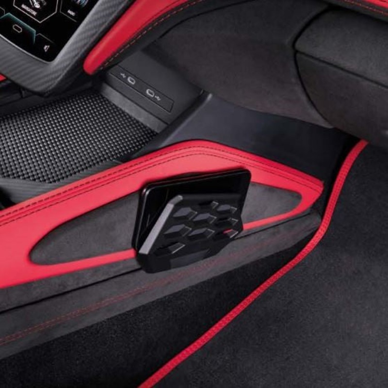 The phone holder is designed to provide secure support for the drivers mobile device within the cabin of the Lamborghini Revuelto.