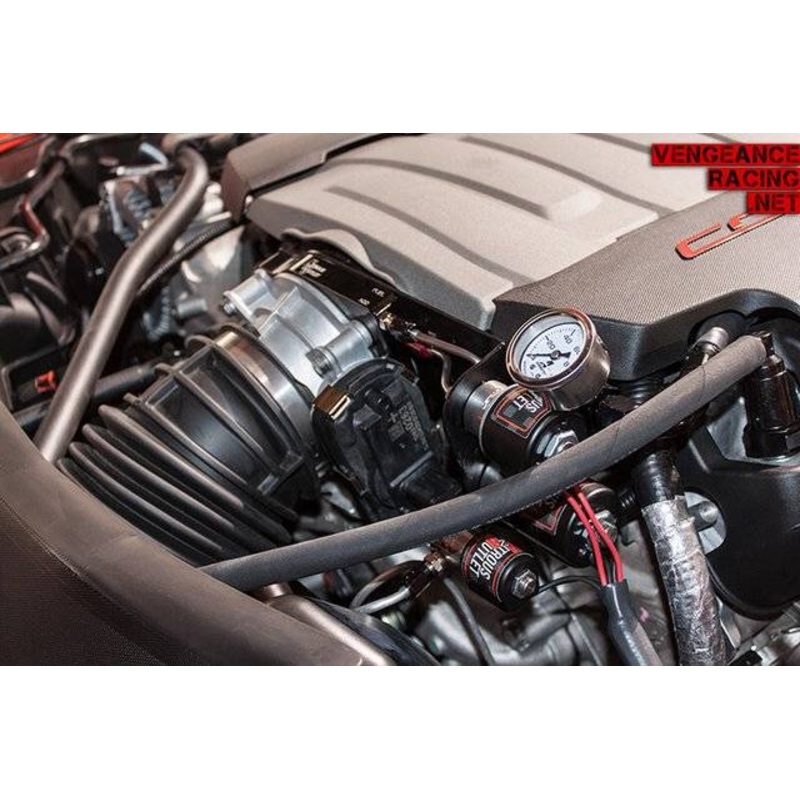 This system is designed specifically for the 2014-2019 LT1 C7 Corvette using the stock intake manifold. A custom solenoid bracket and prefabricated hard-lines bolt directly between the throttle body and intake manifold.