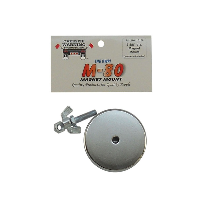 Great for attaching flags to machinery and flat steel surgaces. 2- 5/8″ or 3.2″ diameter chrome steel round base magnet mount. Has 110lb. pull strength. Rust resistant. Includes 1/4″ nylock wing nut to hold flag.
