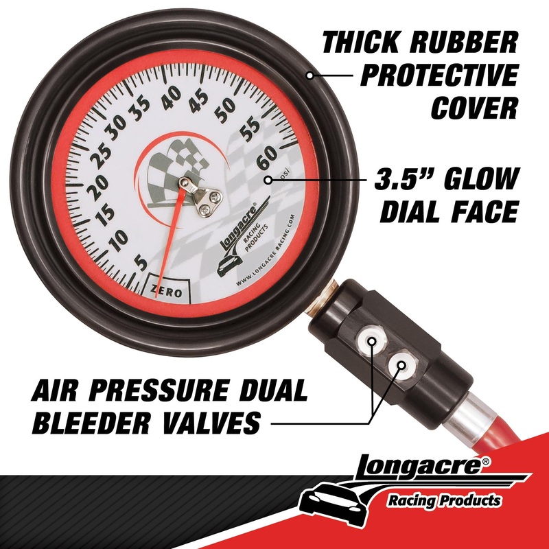 Tire Pressure Gauge – includes both angle and ball chucks and dual bleed buttons for faster setting.