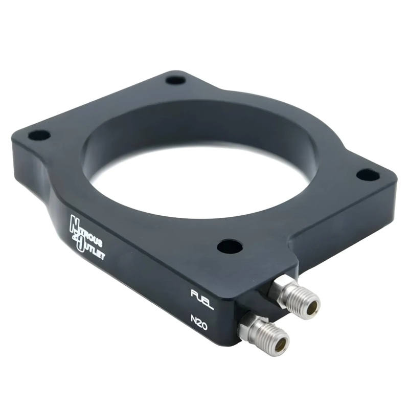 Wet Nitrous Plate. This system includes a billet aluminum plate to fit 90mm Magnuson Superchargers and is capable of flowing up to 400 HP of nitrous. Each billet plate has a black anodized finish with CNC engraved logo and fuel/nitrous labels.