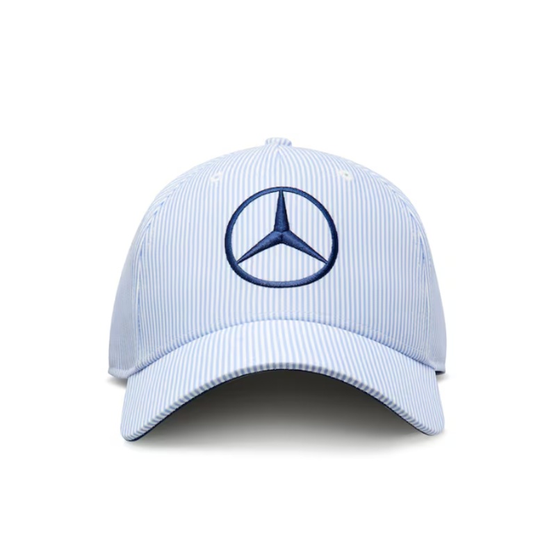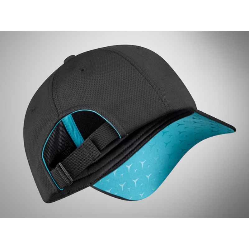 Whether for sport or leisure: the 5-panel baseball cap offers not only first-class wear comfort, but the size can also be easily adjusted with the sporty clip fastener where necessary. That way it can always be adapted to the individual shape of the wearer’s head. And the cap is also visually compelling thanks in part to the inner straps in turquoise and a tonally embroidered Mercedes star. The underside of the visor is also finished in turquoise and also printed with a tonal Mercedes-Benz pattern. Side and back panels made of mesh material round off the design of the black cap and also enhance wear comfort.