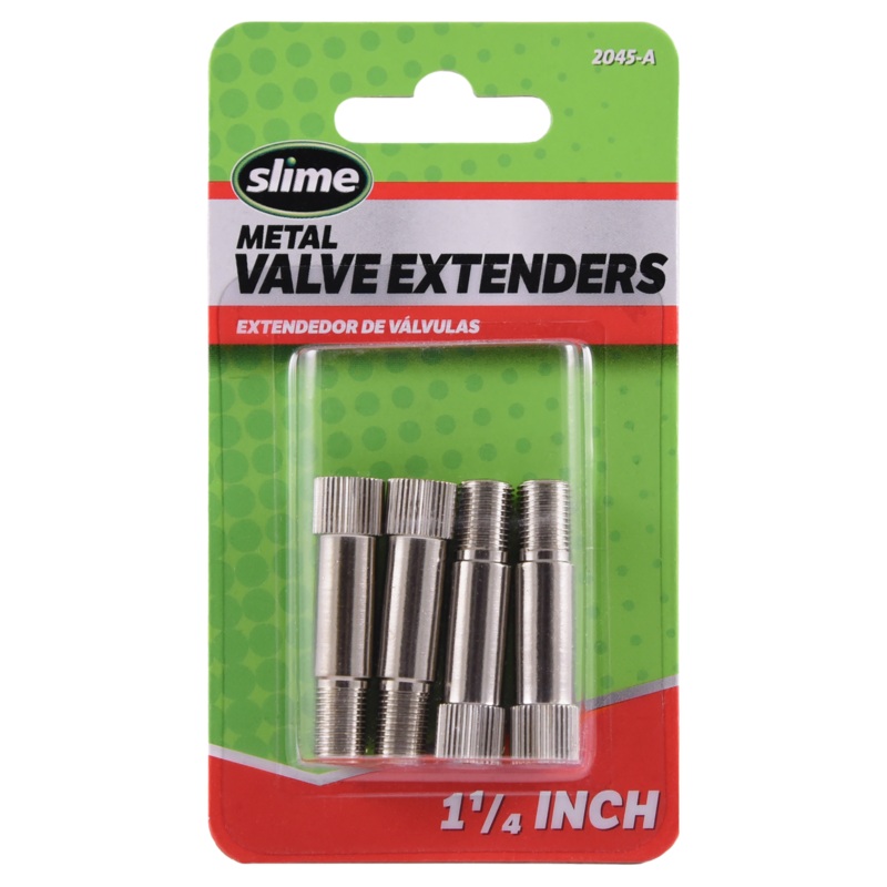 Sometimes, getting to your tire valve stems is just too hard. They could be recessed into the wheel well, covered in gunk, or simply too tough to get to.These solid metal tire valve extenders are 1.25″ long and easily screw onto your tire valves, makingthings far more accessible for inflation and of course, filling with Slime sealant!