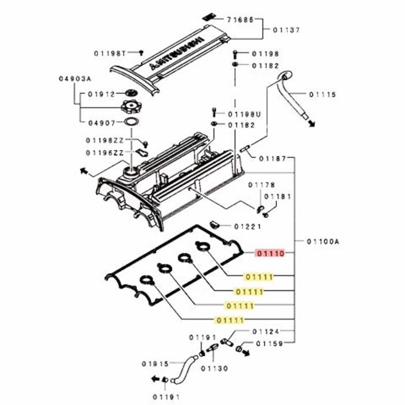 Genuine OEM Mitsubishi factory replacement valve cover gasket and spark plug well gaskets for the Evo 4/5/6/7/8 models. Available as a full replacement set.