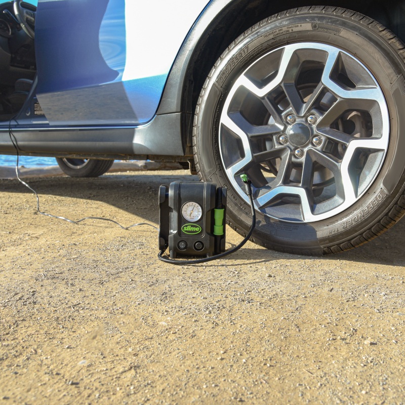 The Multi-Purpose Inflator works with your 12-volt car accessory outlet and features a built-in dial gauge (0-60 psi), three bright LED lights, and a quick connect air hose. It also offers a collapsible handle and easy cord management for clean, compact storage. Get all your inflation needs covered with Slimes Multi-Purpose Inflator!
