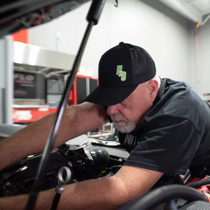 The Nitrous Outlet mesh snap back hat is made from the FlexFit brand product line. The front of the hat is embroidered with the Nitrous Outlet Stacked N2O logo and the side of the hat has the Underlined Nitrous Outlet Logo.