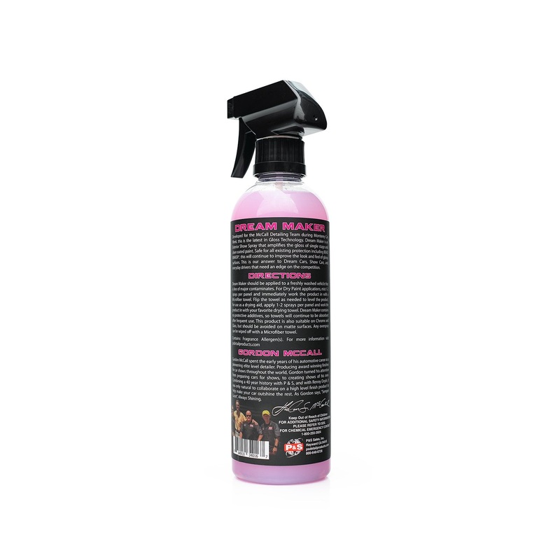 Dream Maker Show Car Gloss Amplifier is for use at events or simply for professionals and enthusiasts who desire to achieve the highest gloss. There is no other way to put it than whats in the name. In your hand, you quite literally hold a DREAM MAKING bottle of PURE GLOSS for your paint. P&S Dream Maker is ideal for shows and car meets. Spray on, buff off, and boom, instant unrivaled gloss! Even if it only adds that extra 1% for your car to acheive that WOW FACTOR to win awards at your favorite Car Show, then Dream Maker is the answer. Dream Maker provides a show car exotic finish with a light layer of protection. Trust the experts and take Dream Maker for a test drive!