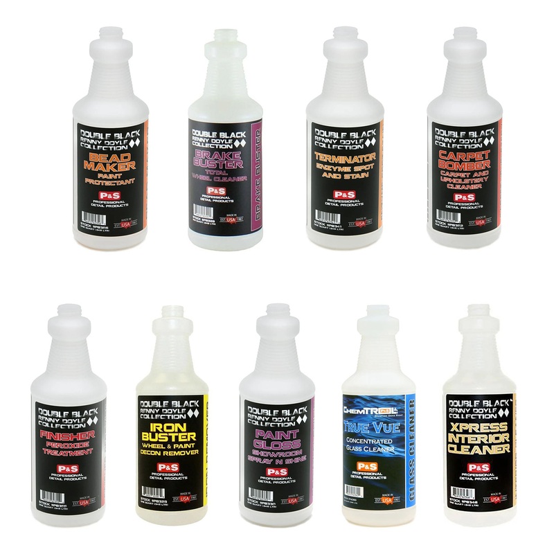 P&S Empty 1L Spray Bottle & Nozzle has become the spray head of choice for professional detailers. It holds up well against all types of chemicals including solvent based tire dressing. The sprayer includes a synthetic o-ring and piston cup built to hold up against harsh chemicals.