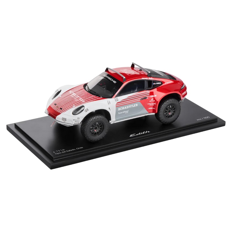 Authentic Design: The model boasts a distinctive white/red exterior perfectly complemented by a sleek black interior, faithfully capturing the unique and rugged aesthetic of the record-breaking “Edith” off-road 911.