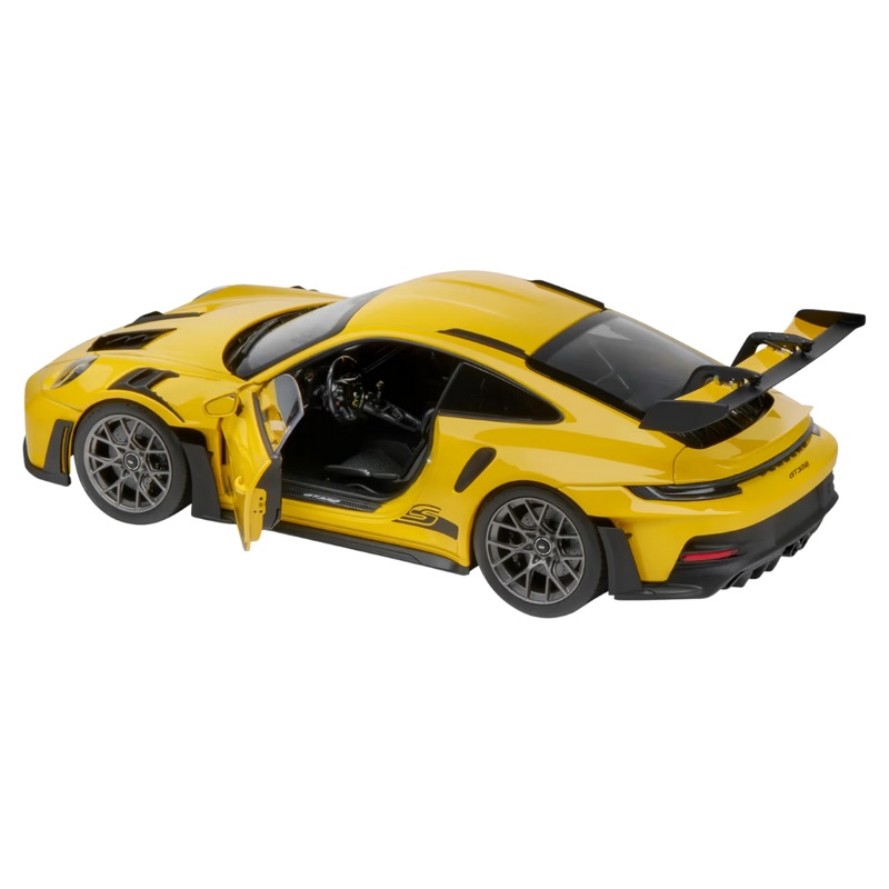 • Authentic Design: The model features a vibrant Racing Yellow exterior perfectly complemented by a sleek black interior, faithfully replicating the aggressive and purposeful aesthetic of the full-sized GT3 RS.