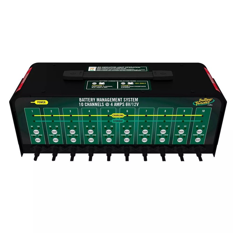This advanced Battery Management System offers ten versatile chargers in one unit. Ten battery chargers with selectable chemistry and voltage allow for the choice to charge AGM, Standard, GEL, or Lithium (LifePO4) batteries. Fully automatic and designed to charge and maintain up to 10 12 volt or 6 volt batteries simultaneously at 4 AMPs. Spark proof and reverse hook-up protection ensure no power will be sent from the charger unless the battery is connected properly. Includes 10 alligator clips, each with a fused 7.5 foot cable.