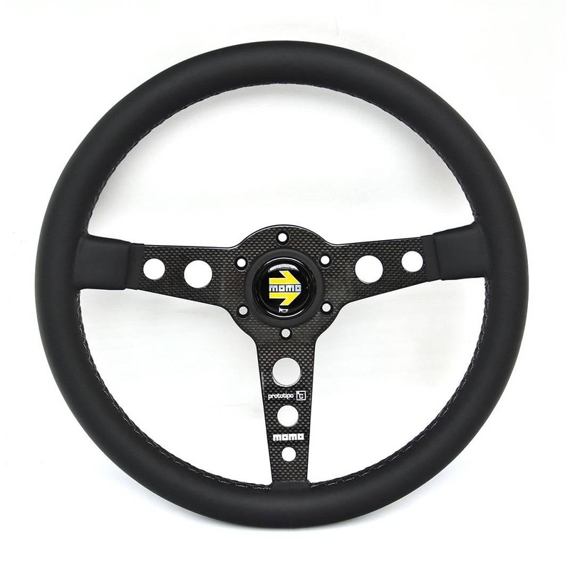 This is a Momo Prototipo 6C Steering Wheel, measuring 350mm in diameter. It’s crafted in Italy and features a premium design with carbon fiber spokes and a leather grip.