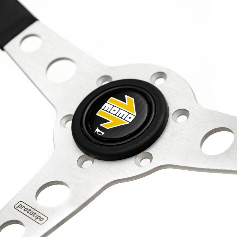 This is a Momo Prototipo Steering Wheel in silver, measuring 350mm in diameter. It’s a classic design compatible with various car models through the use of specific hub adapters (sold separately). The steering wheel includes a Momo horn button. Made in Italy.