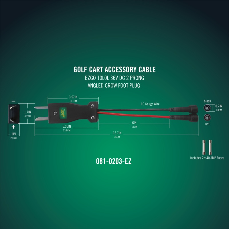 The Battery Tender PowerPlus E-Z-GO 36V DC Plug Accessory Cable is a high-quality, durable solution designed for E-Z-GO models with a 10L0L 2-Prong Angled Crow Foot Plug. Made for easy installation with Battery Tender PowerPlus chargers, this cable ensures a secure and reliable 36V power connection, maximizing your golf cart’s charging performance.