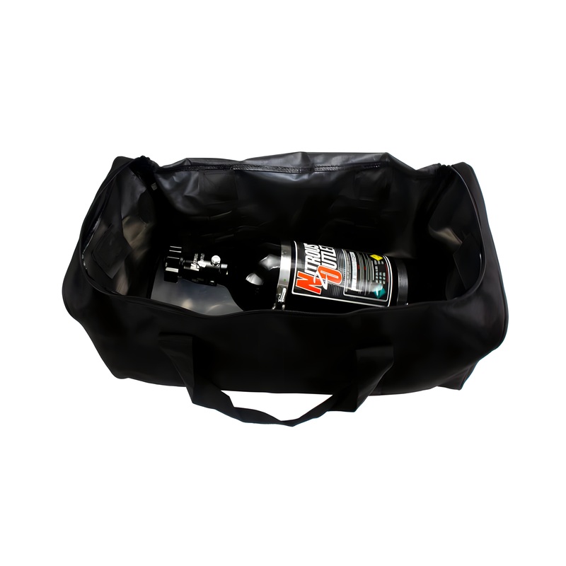 This nitrous kit utilizes a single aluminum 1-1/16″ 90 wet nozzle and a pair of US made solenoids with 3an hoses. The nitrous solenoid features a .078″ orifice, and the fuel solenoid features a .155″ orifice. Solenoids are attached to a custom universal laser cut bracket that is black powdercoated. Nitrous jets are included to allow you to spray 35, 50, 75, 100, 150, and 200hp! The fuel jets included are for gasoline only and are for 45-55psi fuel systems. A 5lb bottle comes pre-attached to a laser cut 5052 Aluminum plate in a high-quality duffel bag for the ultimate stealthy appearance. A 120″ 4an main feed line supplies the solenoid. We even go so far as to include a pre-terminated harness with alligator clips for the battery connection and a Deutsch connector at the solenoids. All you have to do is find a spot in the firewall to pass the harness through. The push button and cord are already wired in to the harness as well.