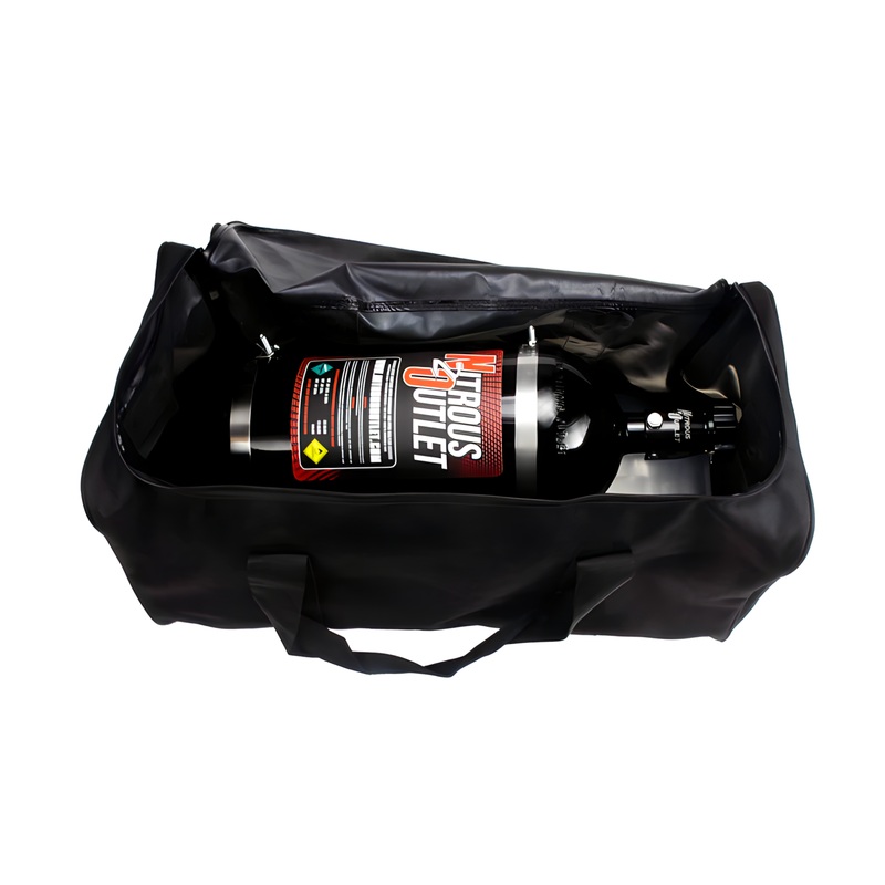 This nitrous kit utilizes a single aluminum 1-1/16″ 90 wet nozzle and a pair of US made solenoids with 3an hoses. The nitrous solenoid features a .078″ orifice, and the fuel solenoid features a .155″ orifice. Solenoids are attached to a custom universal laser cut bracket that is black powdercoated. Nitrous jets are included to allow you to spray 35, 50, 75, 100, 150, and 200hp! The fuel jets included are for gasoline only and are for 45-55psi fuel systems. A 10lb bottle comes pre-attached to a laser cut 5052 Aluminum plate in a high-quality duffel bag for the ultimate stealthy appearance. A 120″ 4an main feed line supplies the solenoid. We even go so far as to include a pre-terminated harness with alligator clips for the battery connection and a Deutsch connector at the solenoids. All you have to do is find a spot in the firewall to pass the harness through. The push button and cord are already wired in to the harness as well.