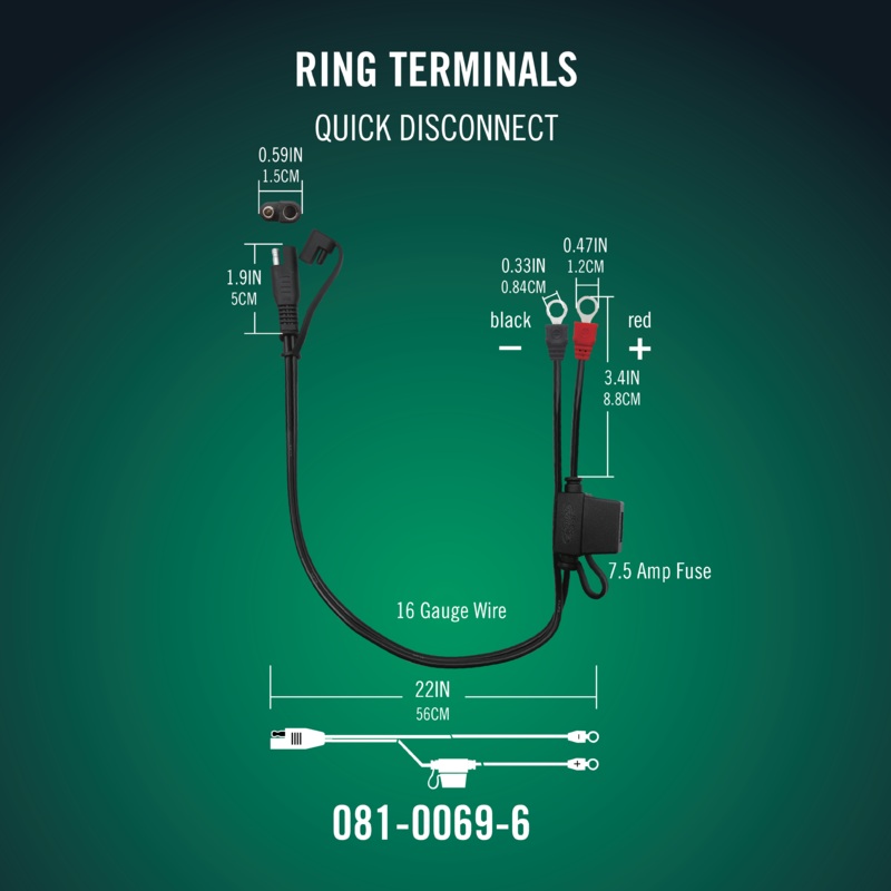 Our 18-inch ring terminal accessory cable securely attaches to any 12V, 8V, or 6V battery using its quick disconnect attachment. With a 7.5 AMP fuse for battery protection, charge your batteries easily and without worry.