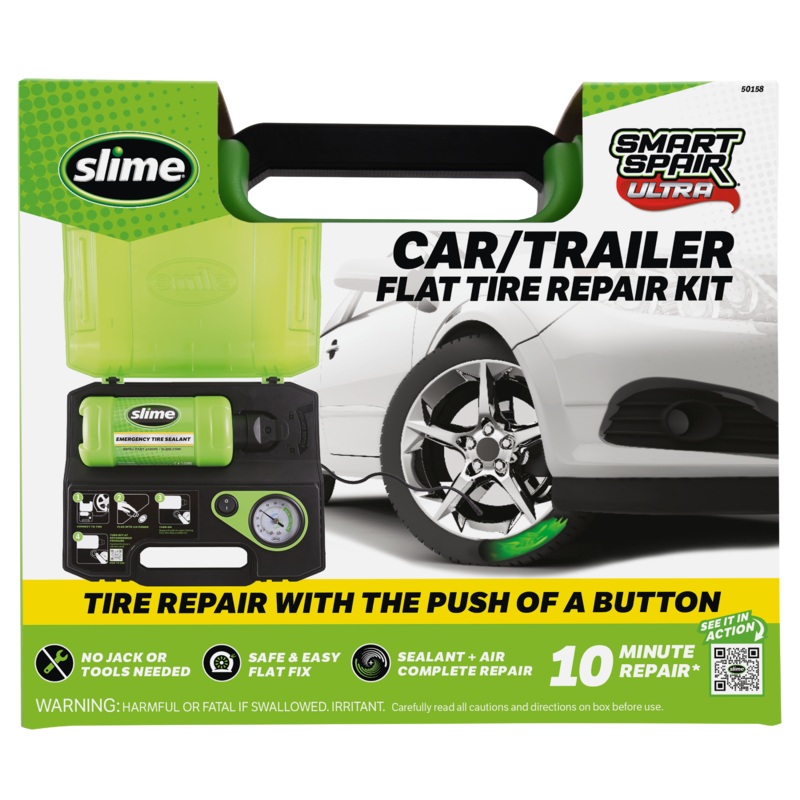 Tire repair with the push of a button!Stop struggling with a spare tire, or waiting for roadside assistance.Slime’s Smart Spair Ultra Flat Tire Repair Kitquickly and easily gets you back on the road in just 10 minutes! Thisreliable tire repair solution instantly repairs car and trailer tires, keeping you and your loved ones safe in a flat tire emergency.