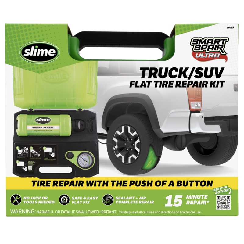 Tire repair with the push of a button!Stop struggling with a spare tire, or waiting for roadside assistance.Slime’s Smart Spair Ultra Flat Tire Repair Kitquickly and easily gets you back on the road in just 15 minutes! This reliable tire repair solution is higher powered to instantly repairlarger truck and SUV tires, keeping you and your loved ones safe in a flat tire emergency.